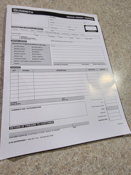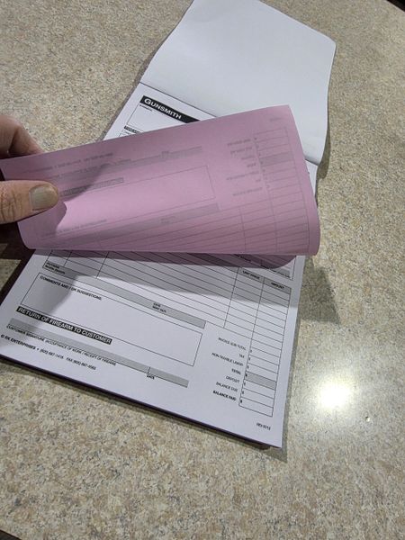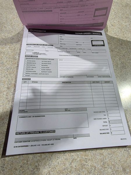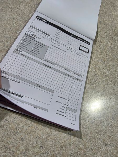 NEW STYLE 50 SETS DUPLICATE OR 100 SHEETS TOTAL Gunsmith Repair Order / Invoice Pad (100 Sheets 8 1/2 x 11) - Highly valued in Gun Shops across the USA, this pad is awesome to write up Repairs and Custom Work.